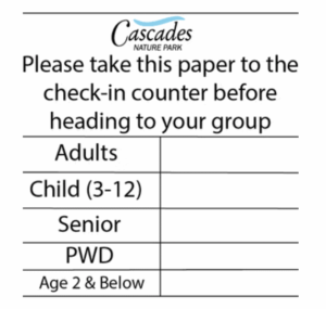 After this, the group entering will receive a piece of paper that lists how many people are entering at that time. Each group entering MUST bring this paper to the check-in counter before heading to the tables / cottages or joining the rest of the group. We will need to verify/collect payment first.