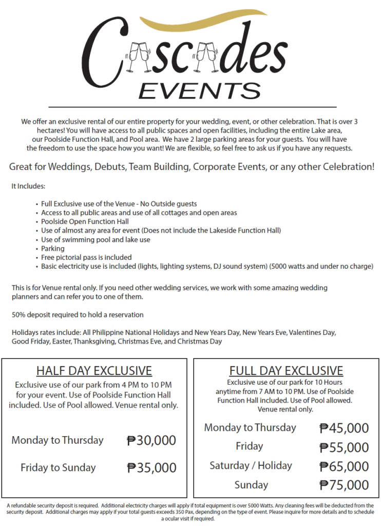 (Does not include 5000 peso security deposit, any cleaning fees if required, or any electricity charges if over 5000 watts total equipment usage)